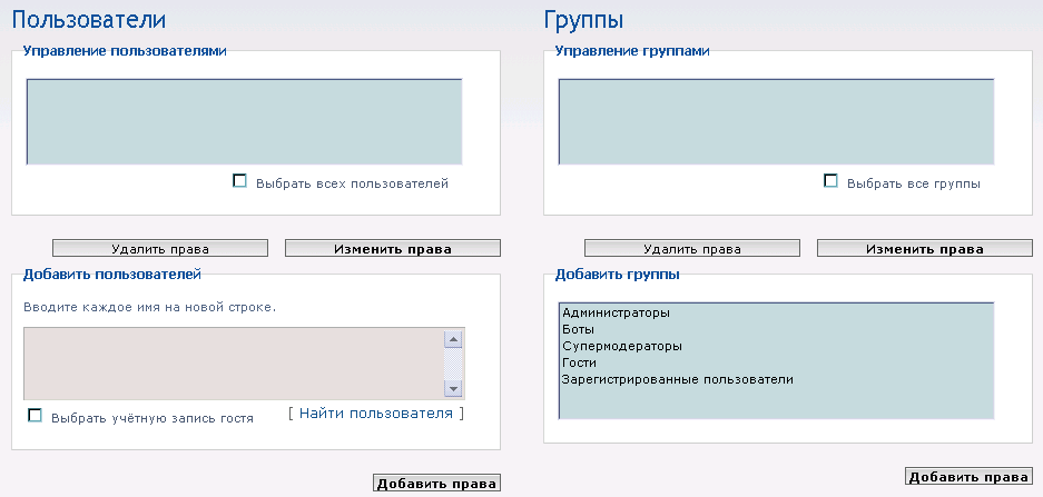 Сторінка «Доступ до форумів » відобразить два стовпці : один для вибору користувачів , інший - для вибору груп . Верхні списки обох стовпців позначені як «Управління користувачами » та «Управління групами » і показують користувачів і групи , які мають певні права , принаймні , в одному з вибраних форумів. Ви можете вибрати їх і змінити їх права доступу , натиснувши кнопку « Змінити права» , або видалити наявні права , натиснувши кнопку "Видалити права» , що призведе до видалення всіх існуючих прав , і, отже , до нездатності бачити форум і мати до нього який - або доступ (якщо вони не мають доступ до нього через іншу групу) . Нижні списки дозволяють додавати нових користувачів та групи , які в даний час не мають прав доступу до вибраних формами .