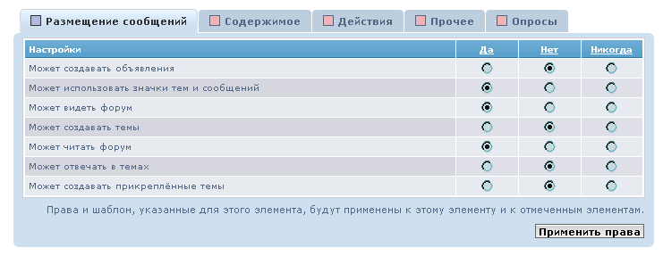 Права доступу для phpBB надзвичайно деталізовані і згруповані в чотири основні розділи: