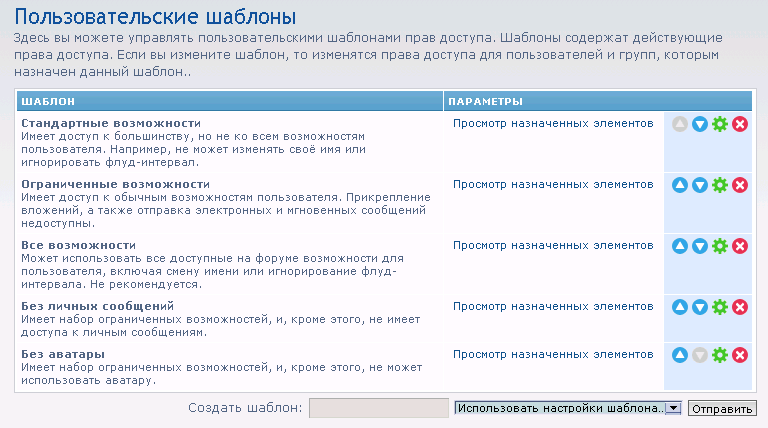 phpBB3 поставляється з декількома шаблонами прав доступу , які пропонують широке розмаїття параметрів для установки прав доступу. Замість того щоб вручну перемикати кожен перемикач , ви можете просто вибрати потрібний вам шаблон прав доступу. Кожен шаблон має докладний опис . Виберіть потрібний шаблон і затвердьте зміни натисненням кнопки "Застосувати права » або « Застосувати всі права » , коли будете задоволені результатом .
