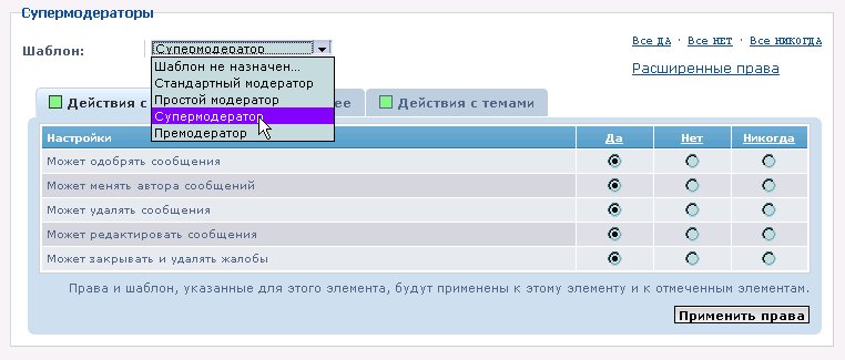 На наступній сторінці ви зможете вибрати , які саме права модератора повинні отримати вибрані користувачі або групи. Перш за все, є деякі передвстановлені шаблони , з яких ви можете вибрати: