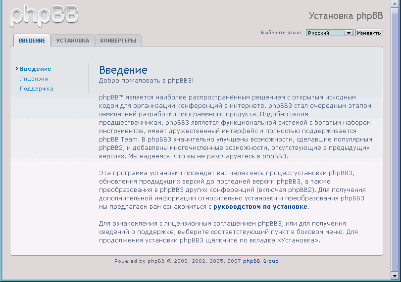 Початкова сторінка установки надає короткий вступ до phpBB . Вона забезпечує інформацією про отримання підтримки і дозволяє прочитати ліцензійну угоду phpBB . Для запуску установки перейдіть на вкладку "Встановлення" ( дивіться малюнок вище ) .